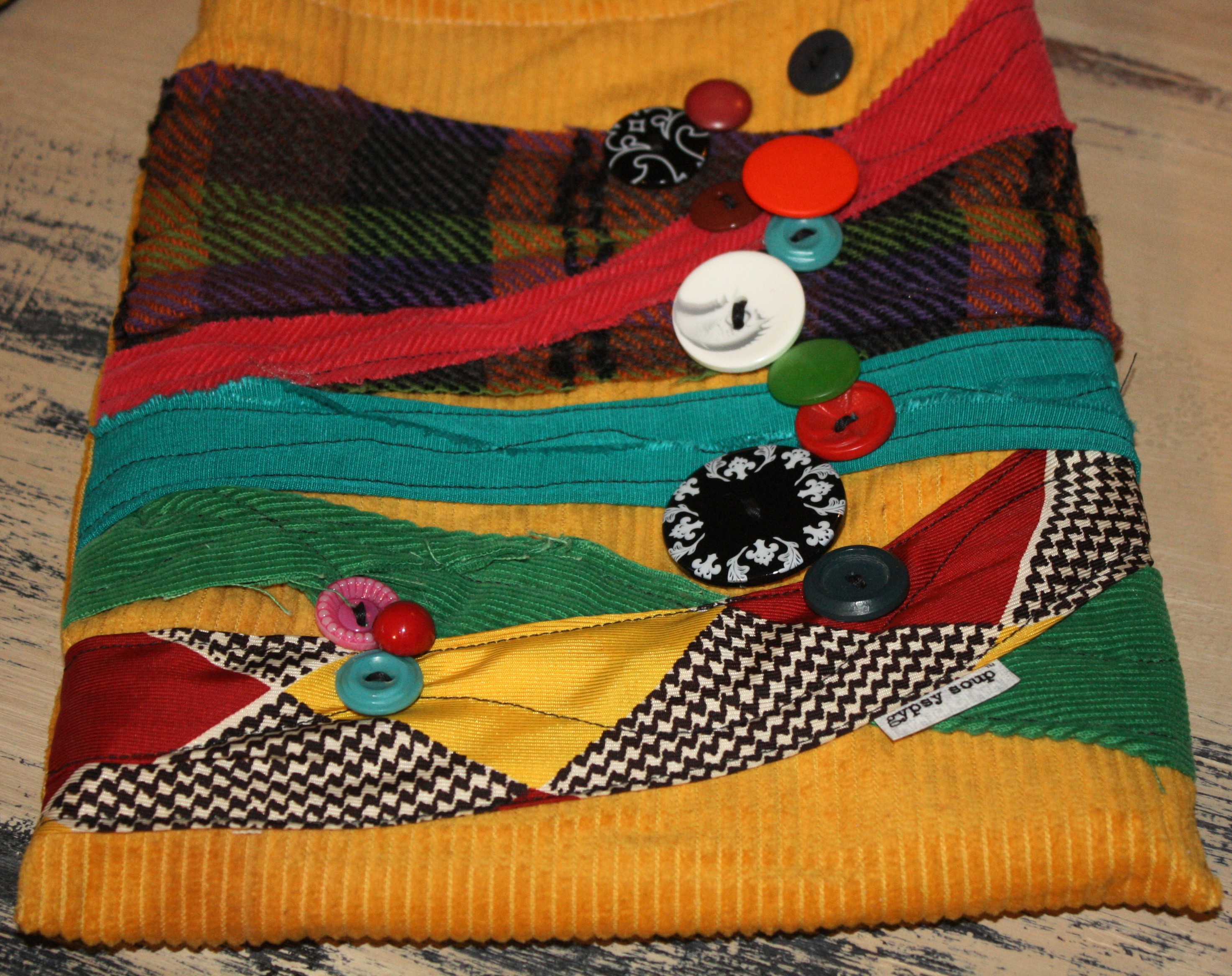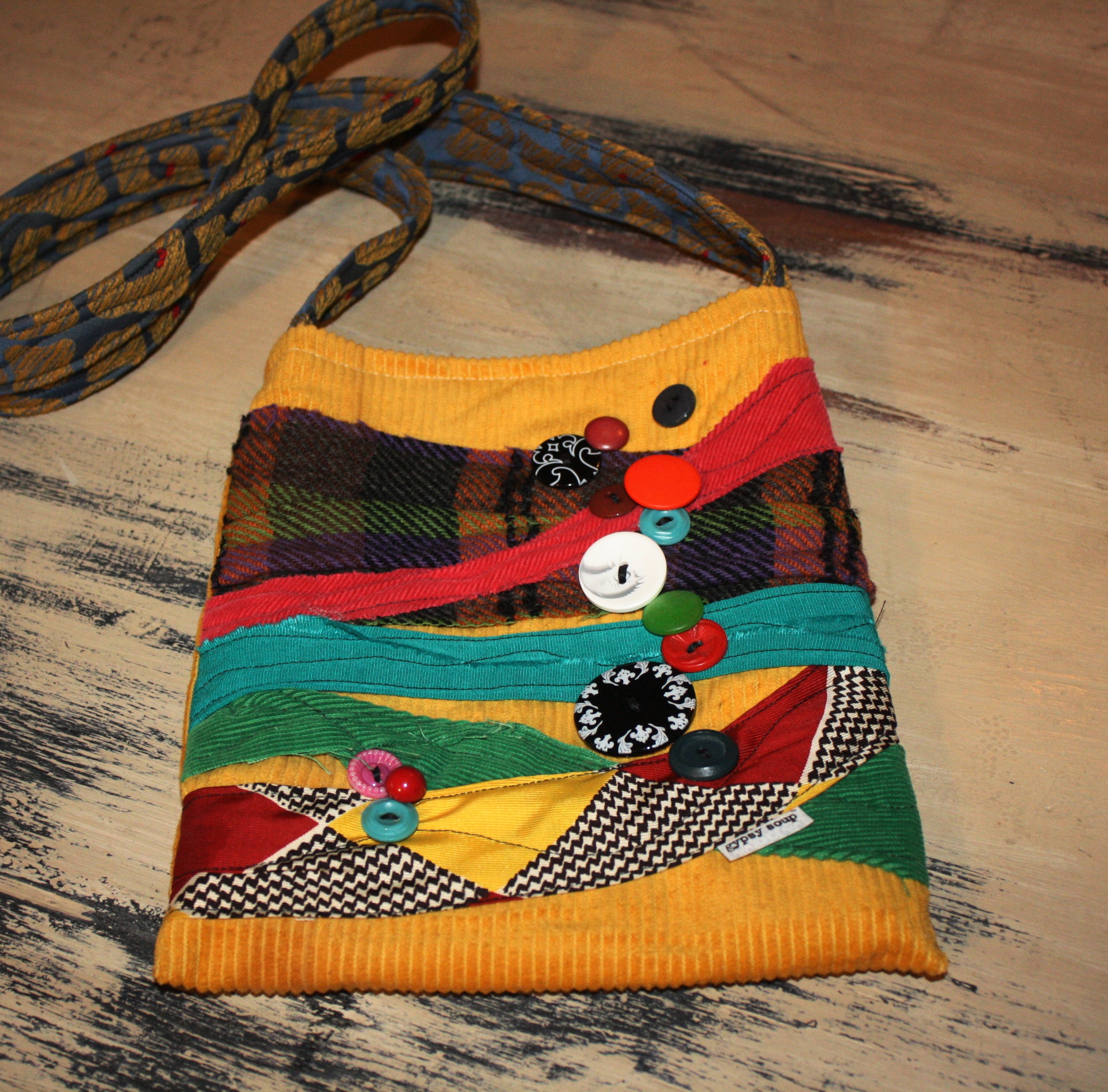 This across body pouch is made of repurposed jackets and/or skirts, with kneck tie guts that make us HAPPY! This pouch was constructed with various vintagey linens, fabrics and tie guts!!! 90% repurposed materials! All Handmade my GypsySoup in Kansas City, Missouri!