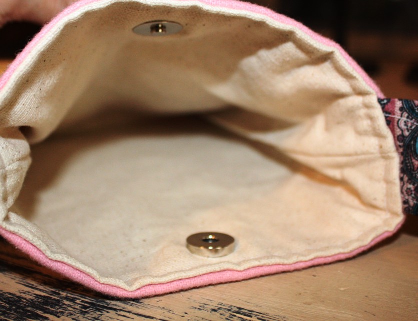 Measuring 8"X9", with a strap that measures approximately 51 1/2" and can be worn across the body or over the shoulder! Fully lined with heavy wear beige canvas/duck cloth and one (1) center magnetic snap closure. I think you'll find this pouch easy to throw on with all your essentials inside! No pockets.