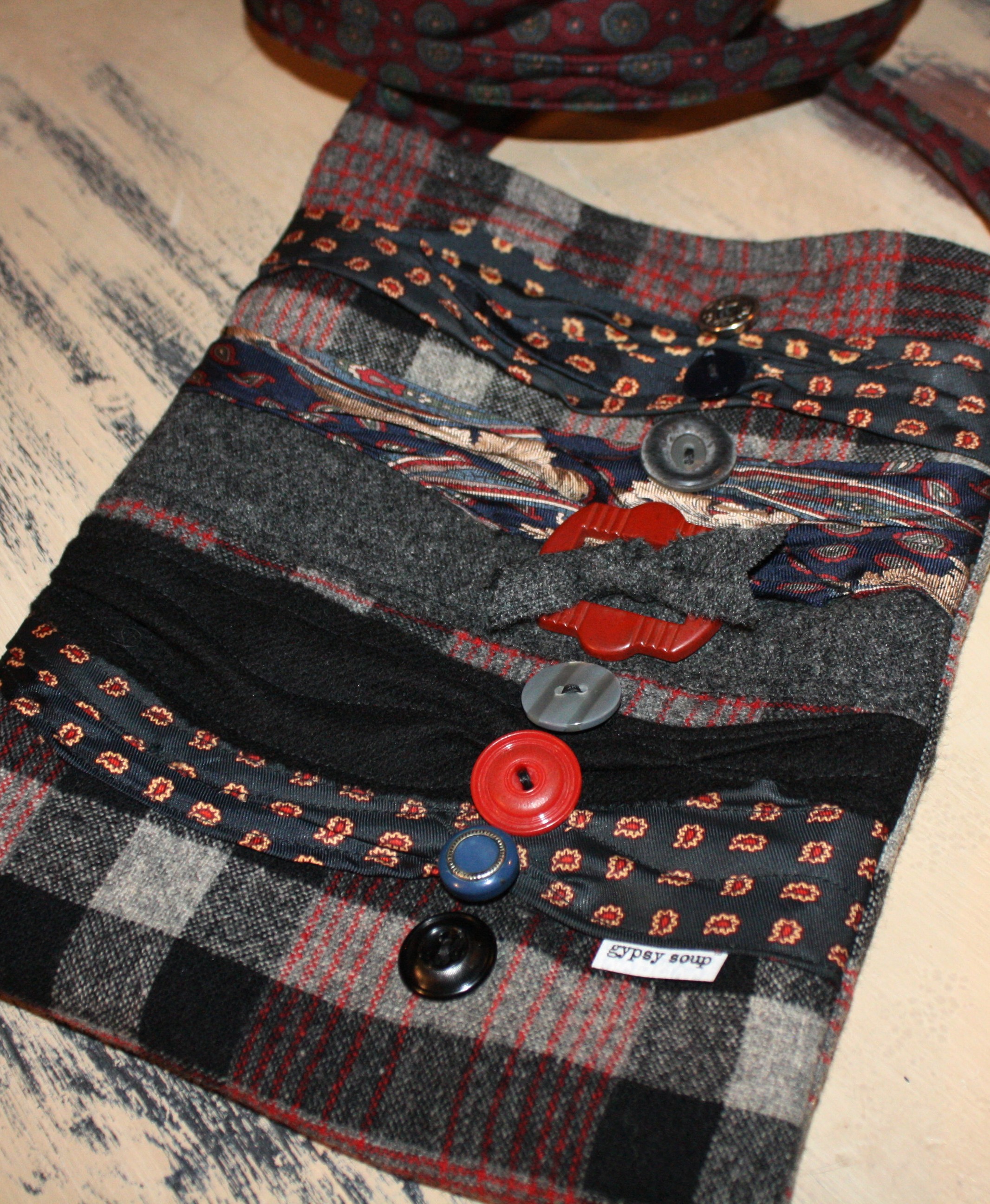 This across body pouch is made of repurposed jackets and/or skirts, with kneck tie guts that make us HAPPY! This pouch was constructed with various vintagey linens, fabrics and tie guts!!! 90% repurposed materials! All Handmade my GypsySoup in Kansas City, Missouri!