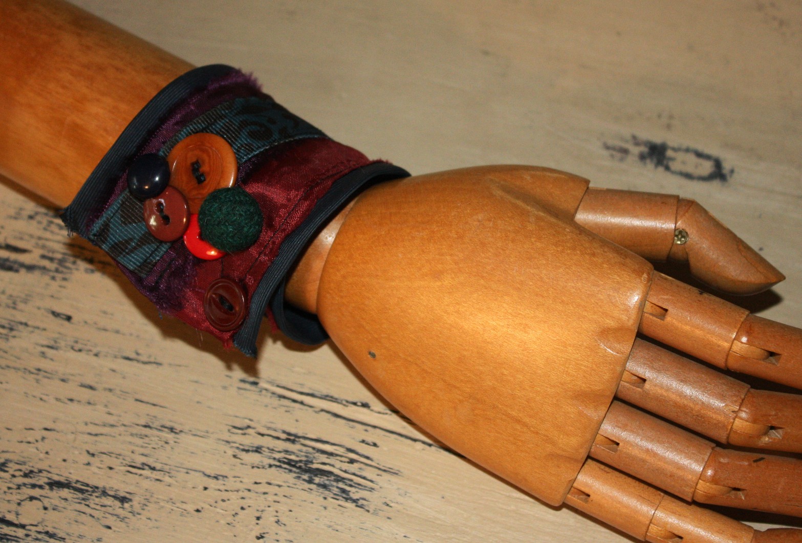 90% repurposed materials, using an UPcycled kneck tie as the base for this wrist cuff, with layers of recycled materials and buttons/tie tags or pendants! Fits wrist 7 1/4" - 7 1/2". Can be worn snug or loose, depending on the size of your wrist. Velcro closure. This is a soft wrist cuff!