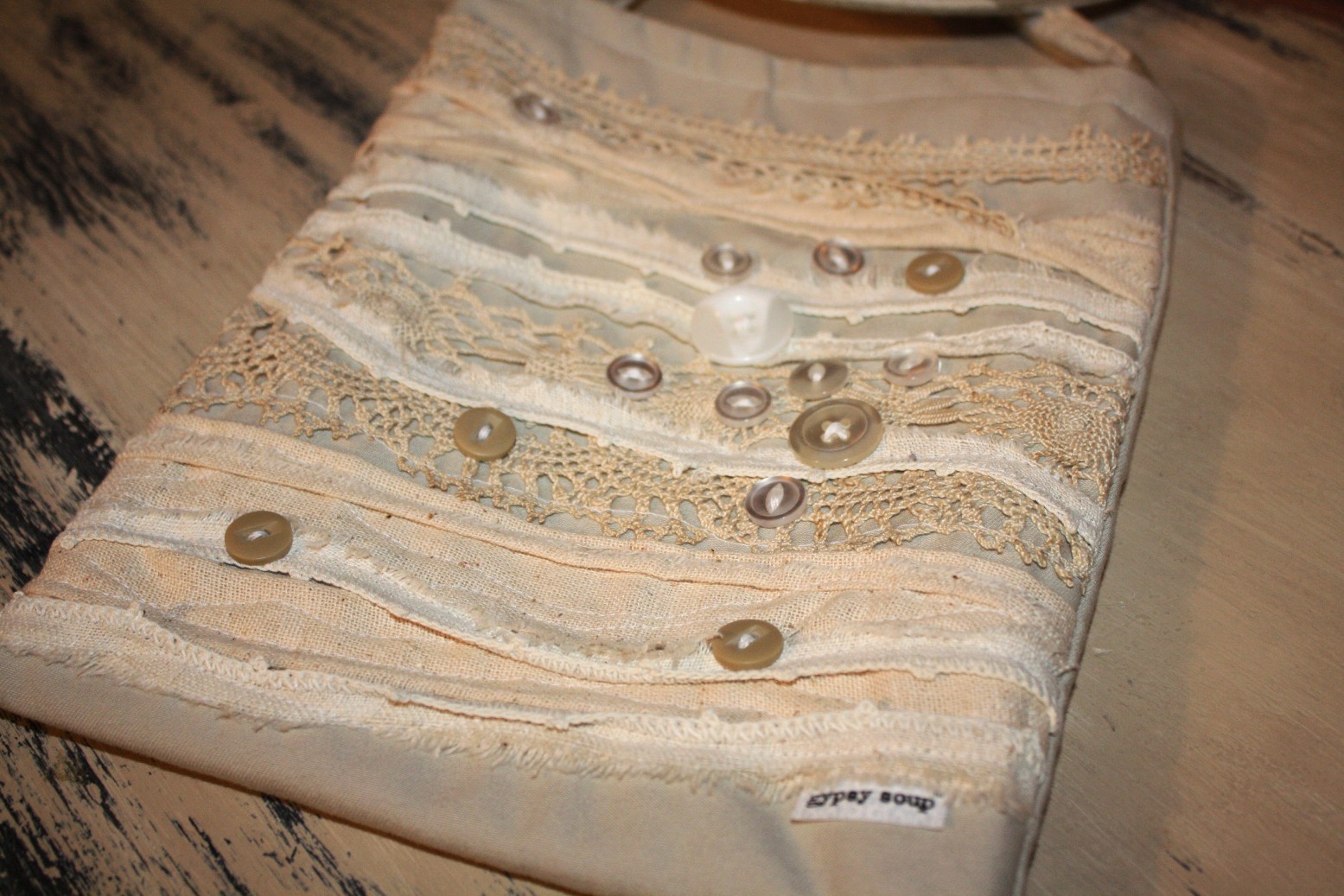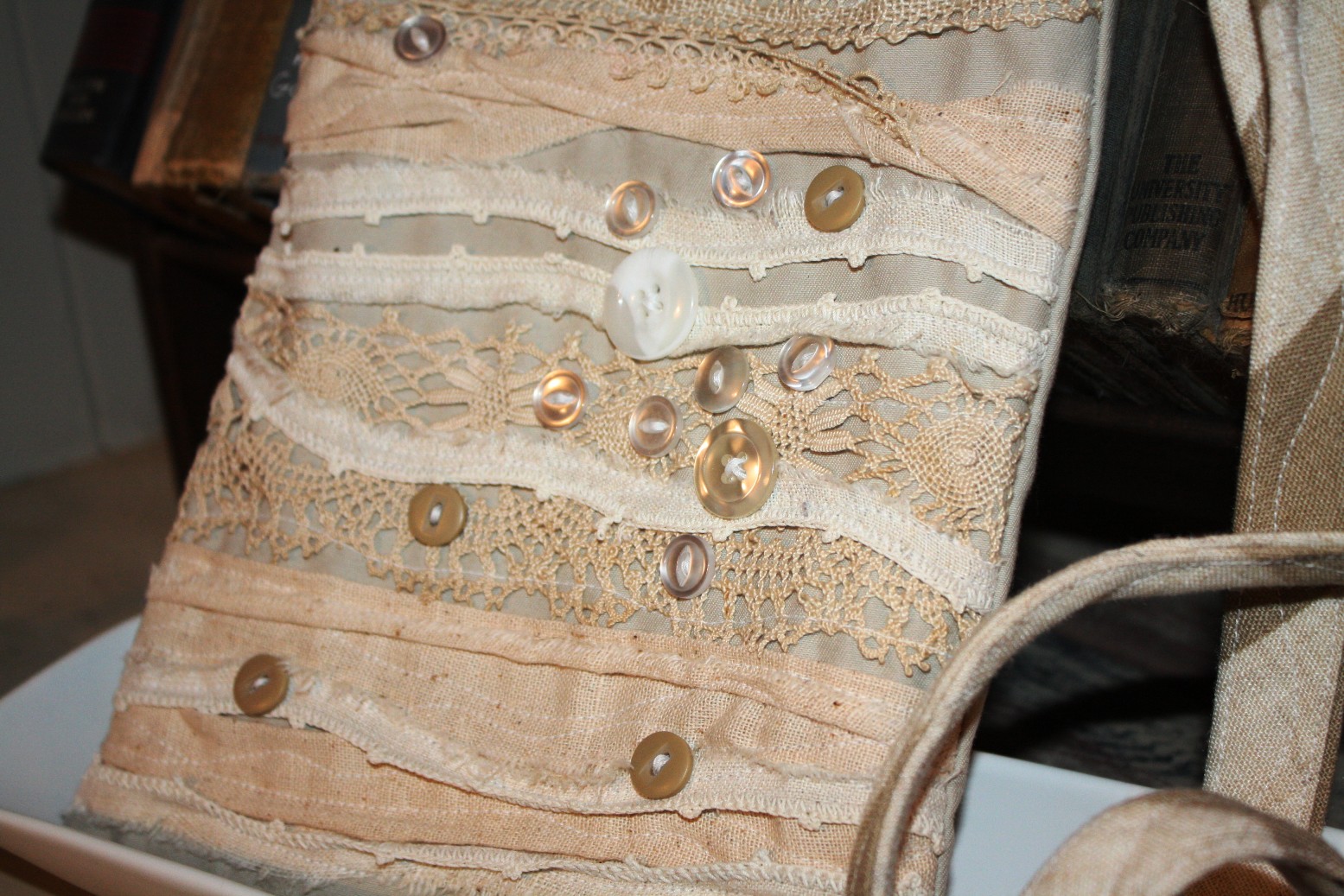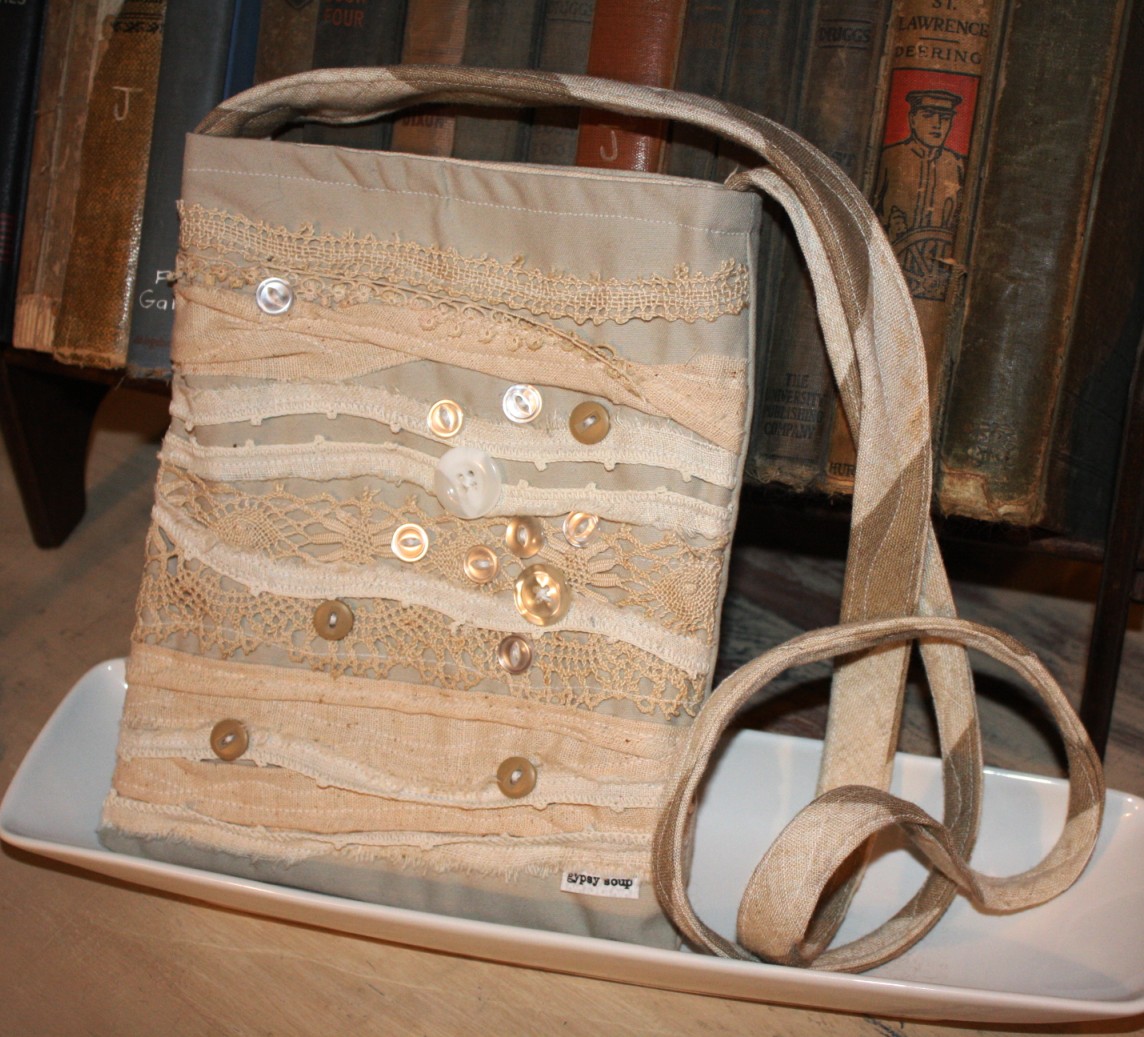 This across body pouch is made of repurposed jackets and/or skirts, with kneck tie guts that make us HAPPY! This pouch was constructed with various vintagey linens, fabrics and tie guts!!! 90% repurposed materials! All Handmade my GypsySoup in Kansas City, Missouri!