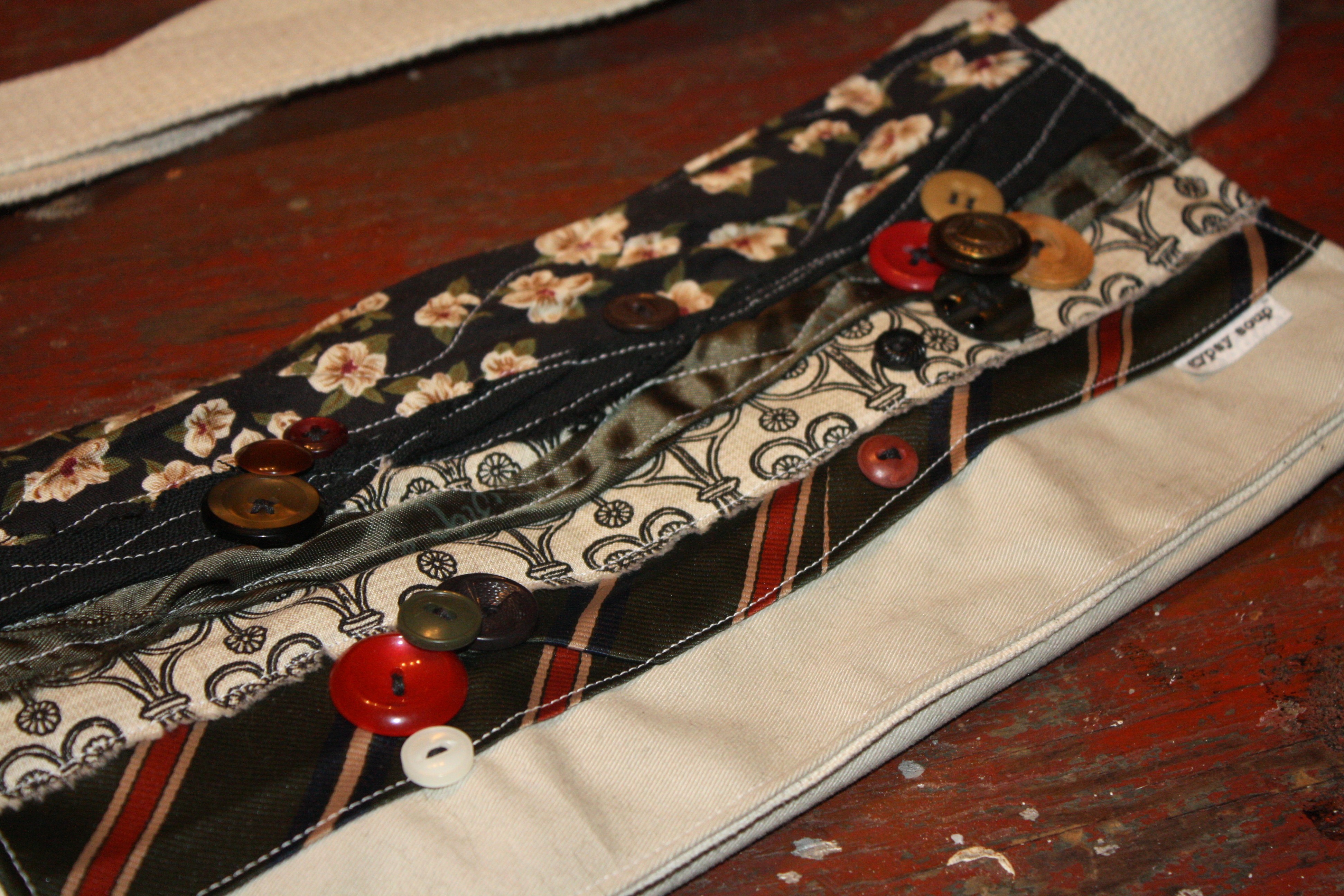 90% repurposed materials, measuring approximately 7"x11" with a 2" depth for all your stuff! Created using UPcycled skirts and/or jackets as the base for the pack, with layers of recycled materials and buttons/tie tags/kneck ties and/or pendants as toppings! Fully lined with beige heavy wear canvas - 2 magnetic snap closures. No pockets. The belt/strap has an adjustable D-ring closure ~ it is 1 3/4" wide and adjusts from 31" to 46". Can be worn around the waist or over the shoulder (shown in the 2 sample photos).