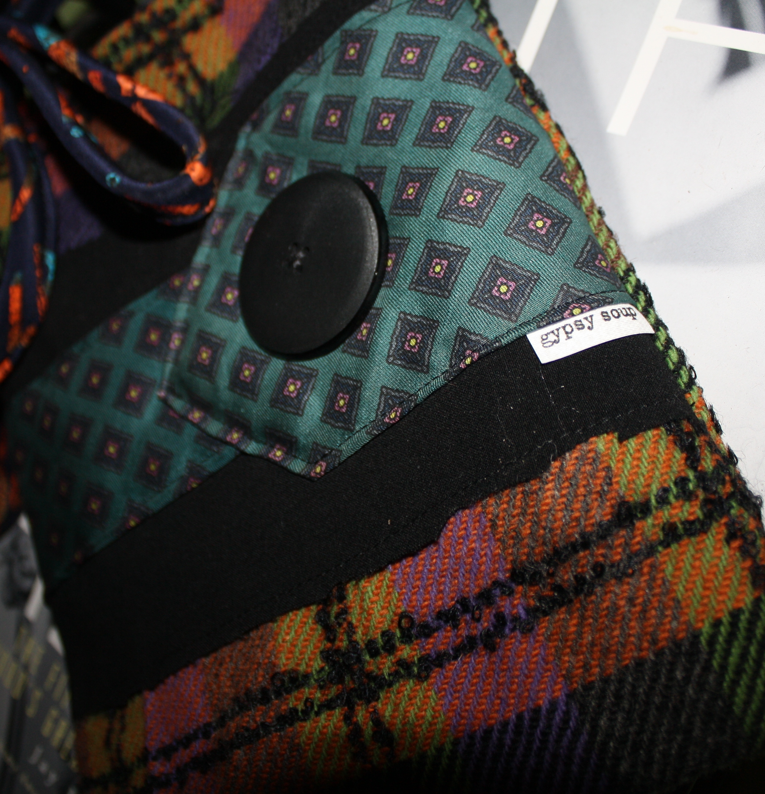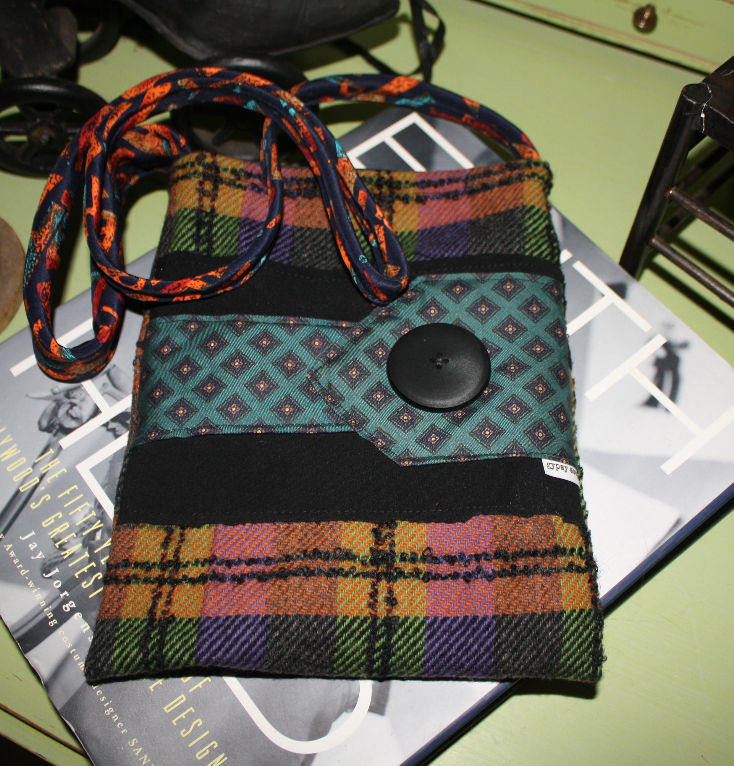 This across body pouch is made of repurposed jackets and/or skirts, with kneck tie guts to make us HAPPY! LOVE this Beatles themed tie strap!