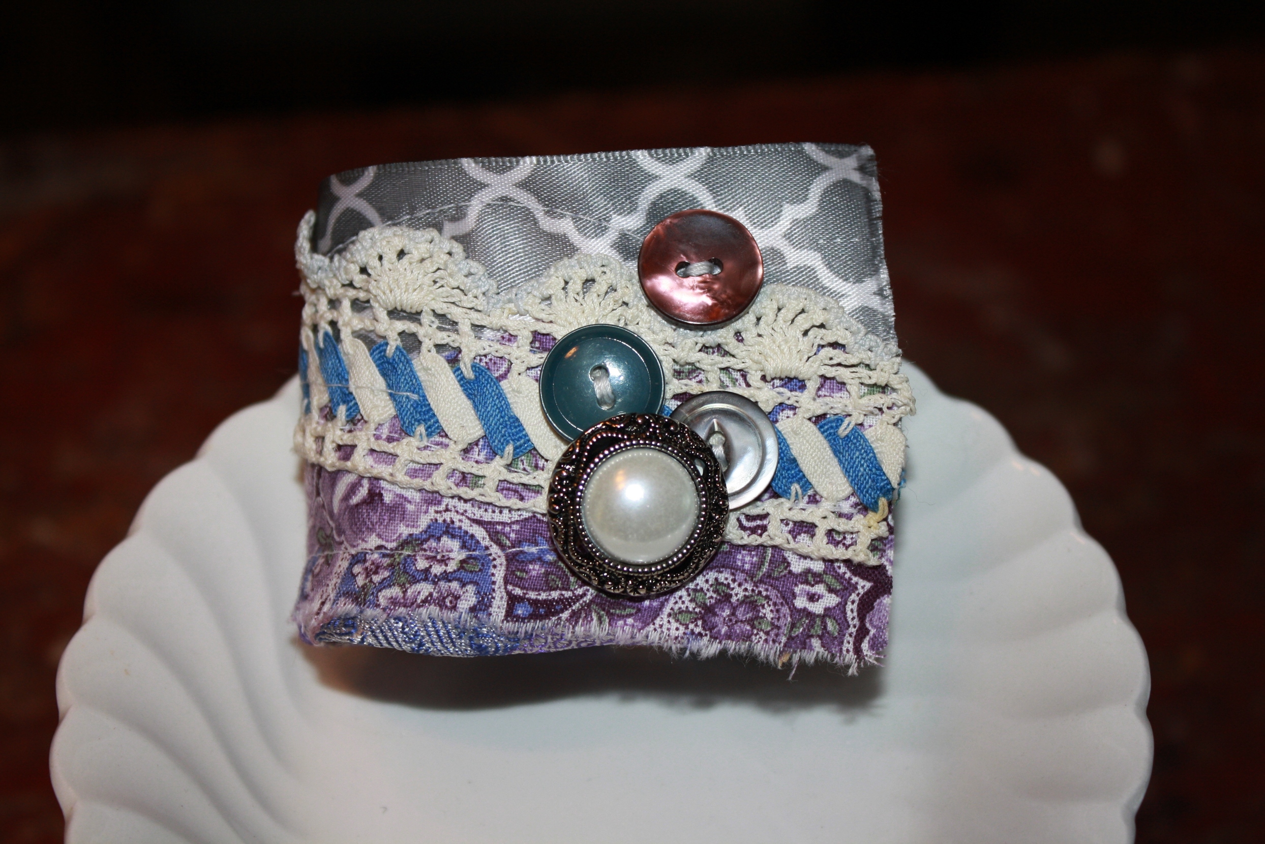 90% repurposed materials, using an UPcycled kneck tie as the base for this wrist cuff, with layers of recycled materials and buttons/tie tags or pendants! Fits wrist 7 1/2" - 7 3/4". Can be worn snug or loose, depending on the size of your wrist. Velcro closure. This is a soft wrist cuff!