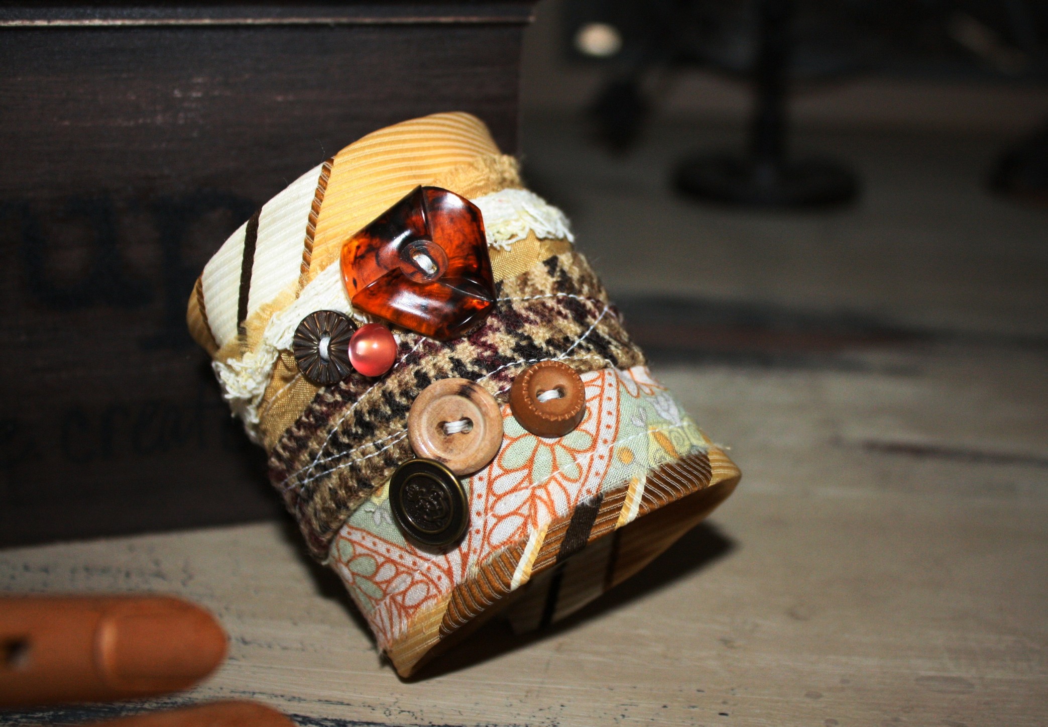 90% repurposed materials, using an UPcycled kneck tie as the base for this wrist cuff, with layers of recycled materials and buttons/tie tags or pendants! Fits wrist 7". This is a 3" wide cuff. Can be worn snug or loose, depending on the size of your wrist. Velcro closure. This is a soft wrist cuff!