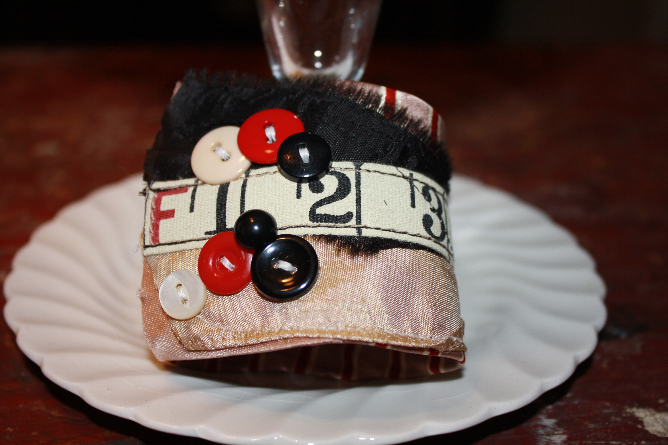 90% repurposed materials, using an UPcycled kneck tie as the base for this wrist cuff, with layers of recycled materials and buttons/tie tags or pendants! Fits wrist 7". This is a 2 1/4" wide cuff. Can be worn snug or loose, depending on the size of your wrist. Velcro closure. This is a soft wrist cuff!