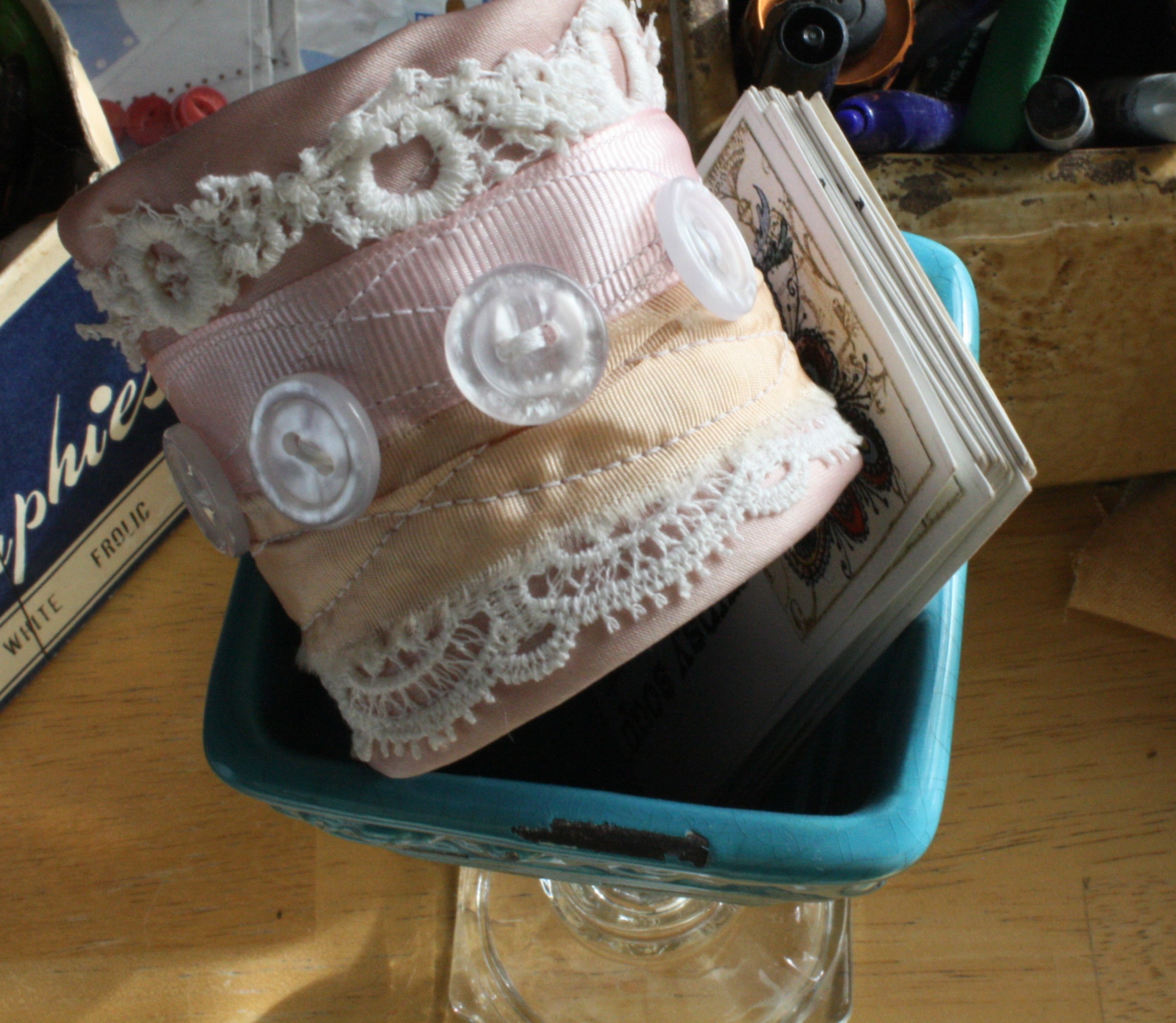 90% repurposed materials, using an UPcycled kneck tie as the base for this wrist cuff, with layers of recycled materials and buttons/tie tags or pendants! Fits wrist 6 3/4". This is a 2 1/2" wide cuff. Can be worn snug or loose, depending on the size of your wrist. Velcro closure. This is a soft wrist cuff!