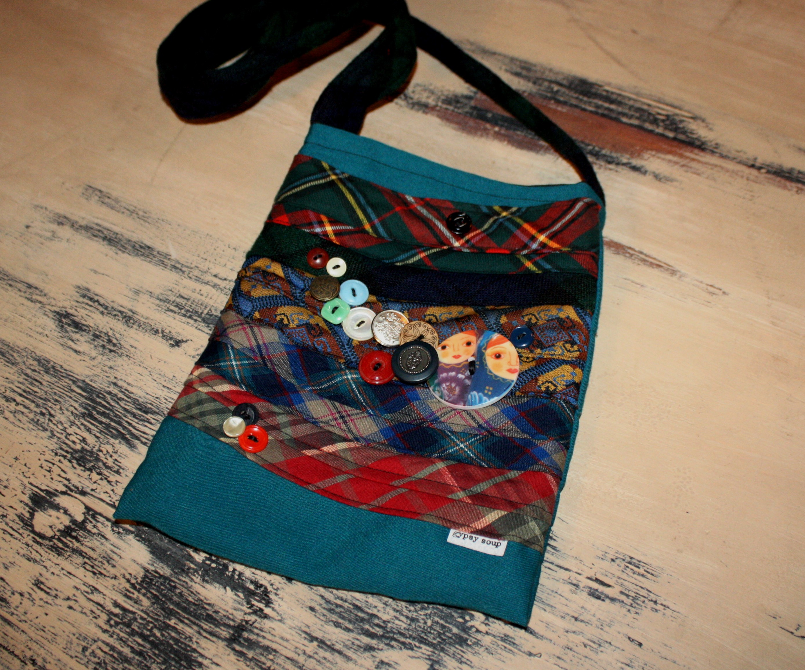 This across body pouch is made of repurposed jackets and/or skirts, with kneck tie guts that make us HAPPY! This pouch was constructed with various vintagey linens, fabrics and tie guts!!! 90% repurposed materials! All Handmade my GypsySoup in Kansas City, Missouri!