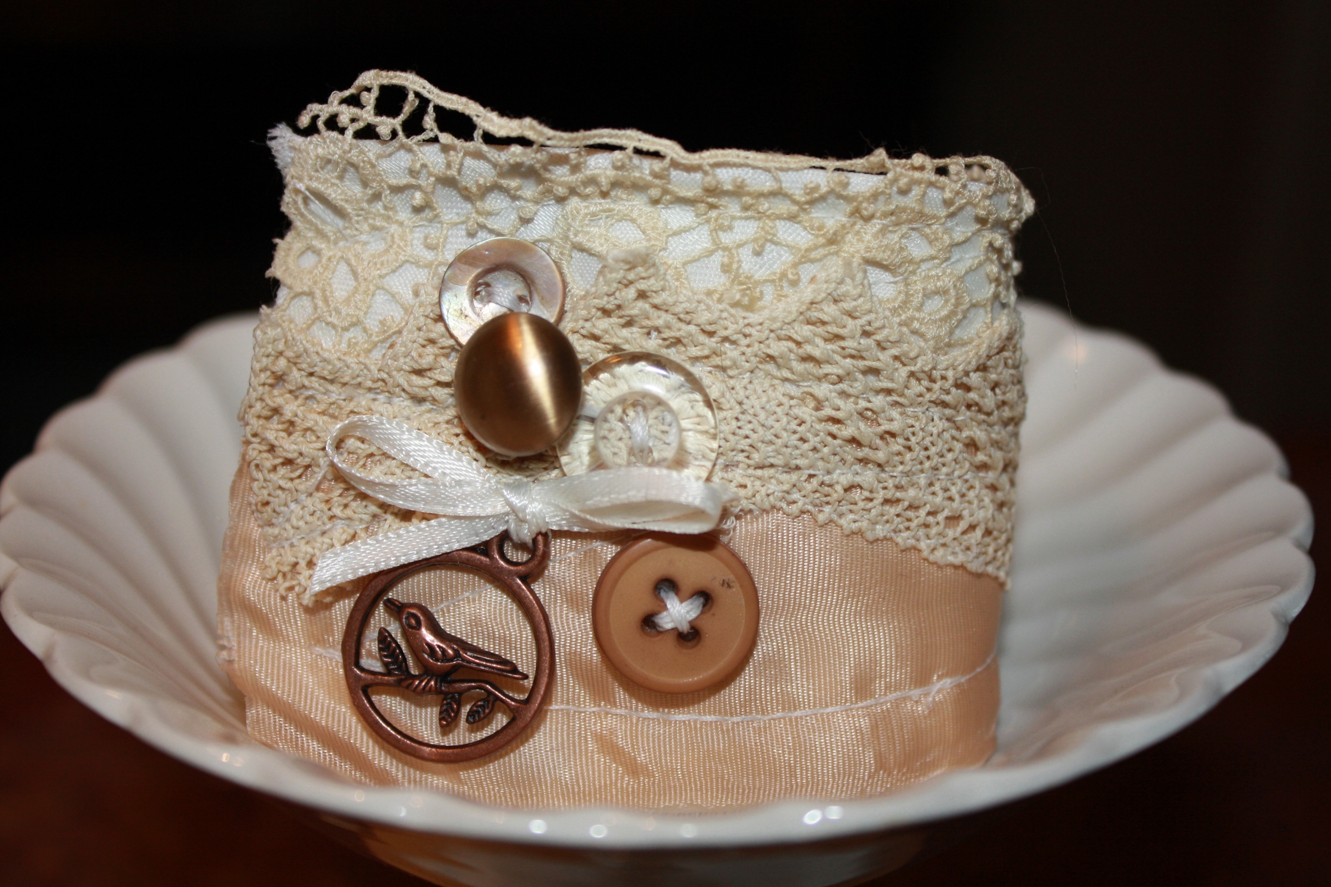 90% repurposed materials, using an UPcycled kneck tie as the base for this wrist cuff, with layers of recycled materials and buttons/tie tags or pendants! Fits wrist 7" - 7 1/2". Can be worn snug or loose, depending on the size of your wrist. Velcro closure. This is a soft wrist cuff!
