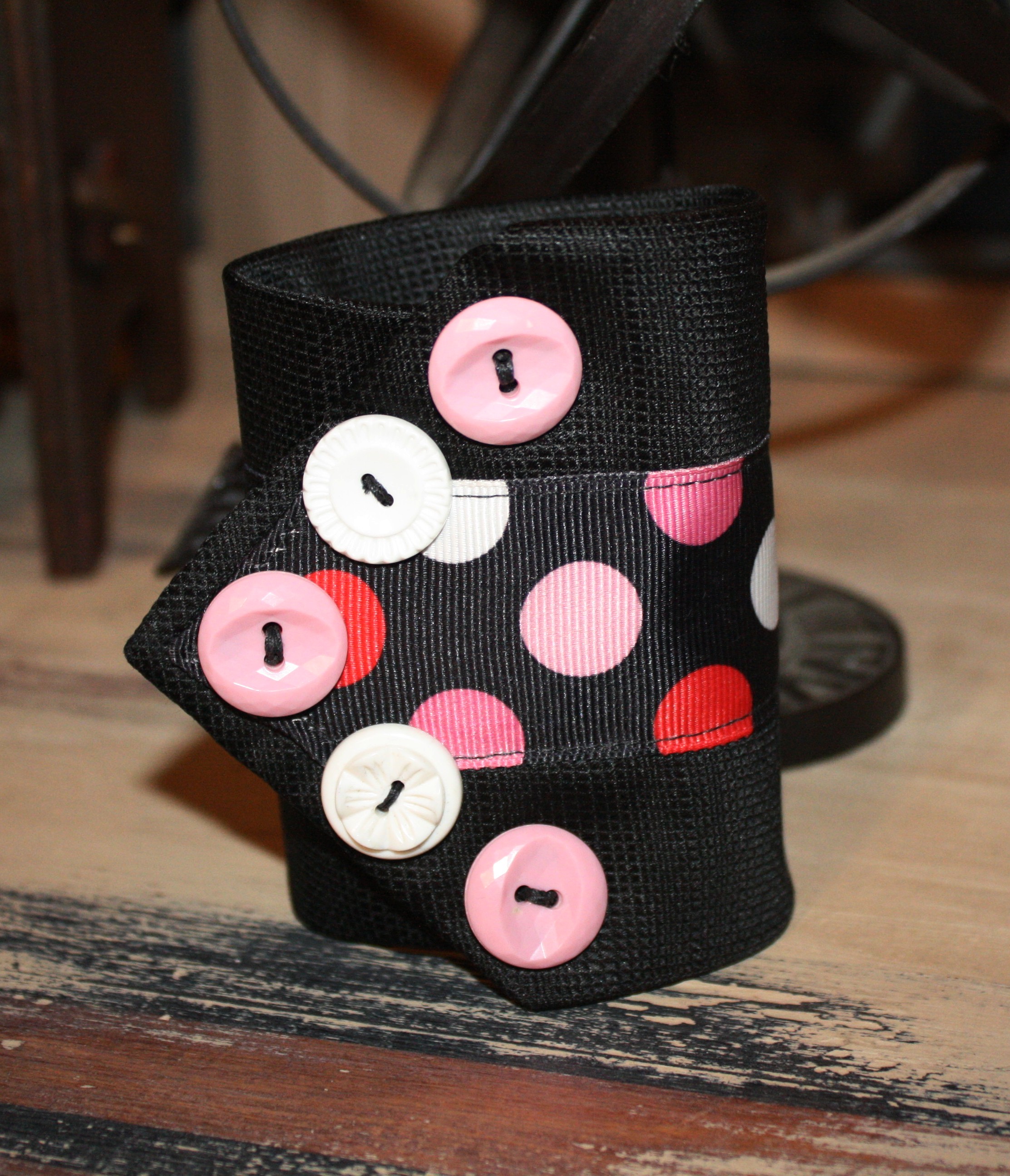 90% repurposed materials, using an UPcycled kneck tie as the base for this wrist cuff, with layers of recycled materials and buttons/tie tags or pendants! Fits wrist 7 1/2". This is a 4" wide cuff. Can be worn snug or loose, depending on the size of your wrist. Velcro closure. This is a soft wrist cuff!