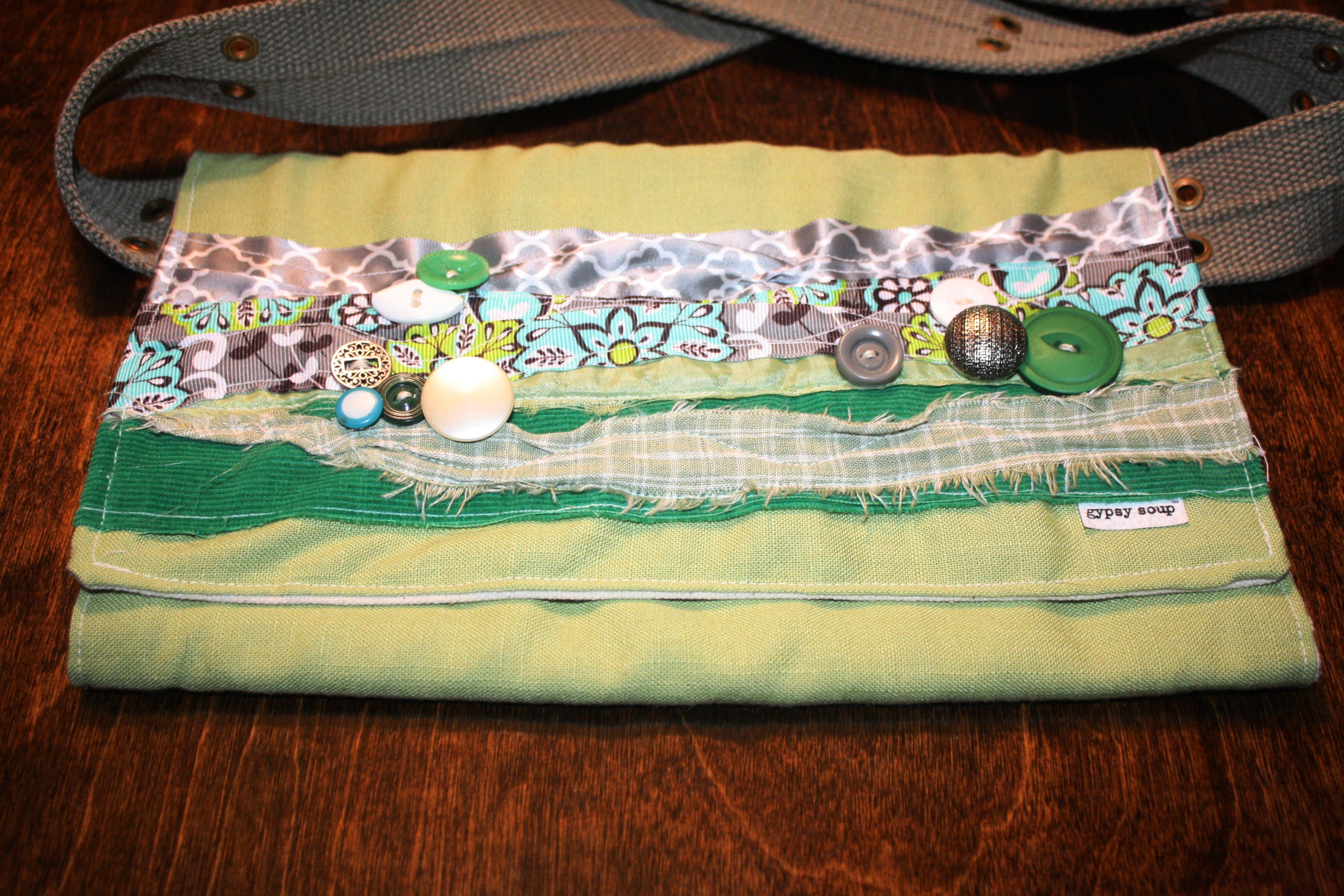90% repurposed materials, measuring approximately 7"x11" with a 2" depth for all your stuff! Created using UPcycled skirts and/or jackets as the base for the pack, with layers of recycled materials and buttons/tie tags/kneck ties and/or pendants as toppings! Fully lined with beige heavy wear canvas - 2 magnetic snap closures. No pockets. The belt/strap has an adjustable D-ring closure ~ it is 1 3/4" wide and adjusts from 31" to 46". Can be worn around the waist or over the shoulder (shown in the 2 sample photos).