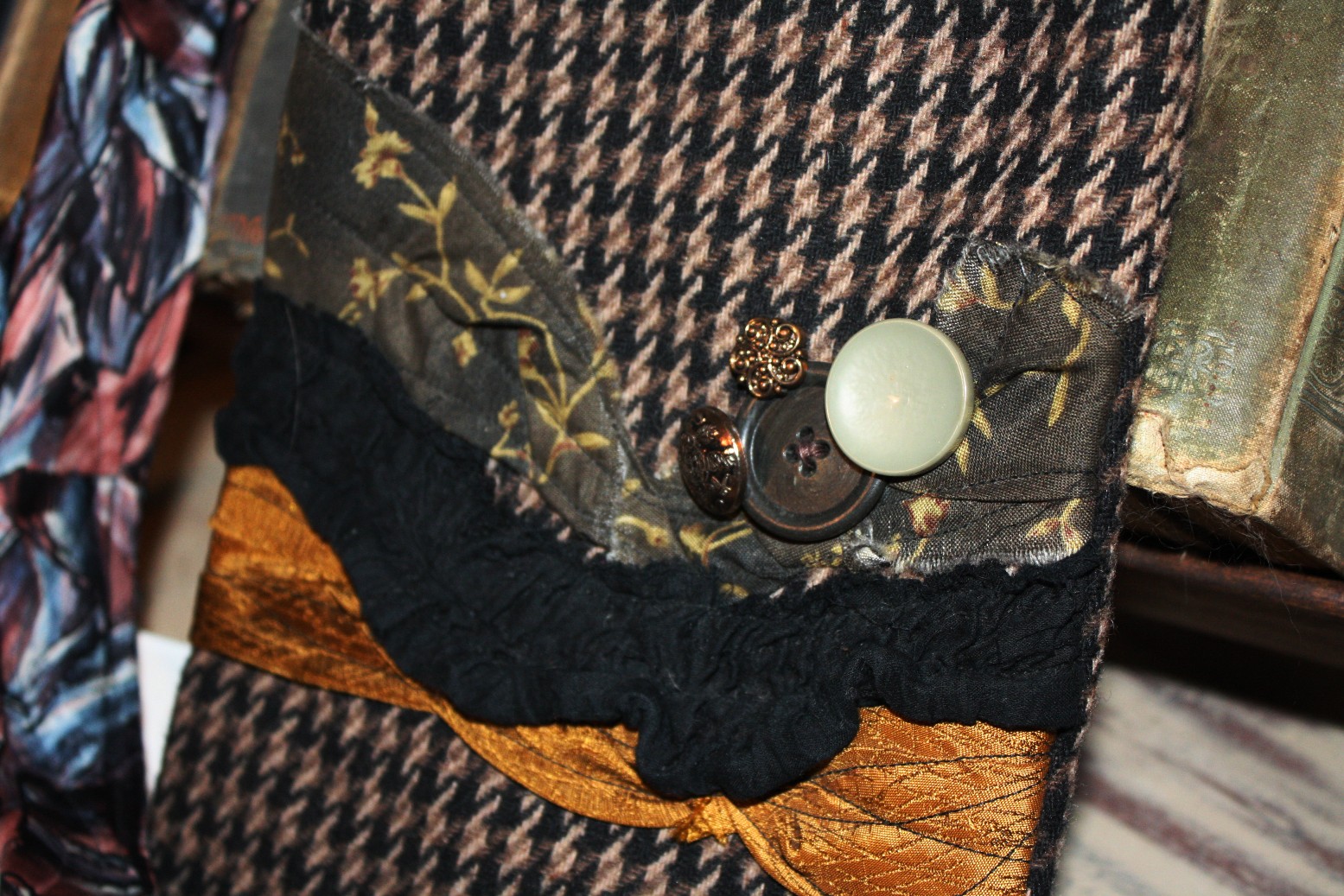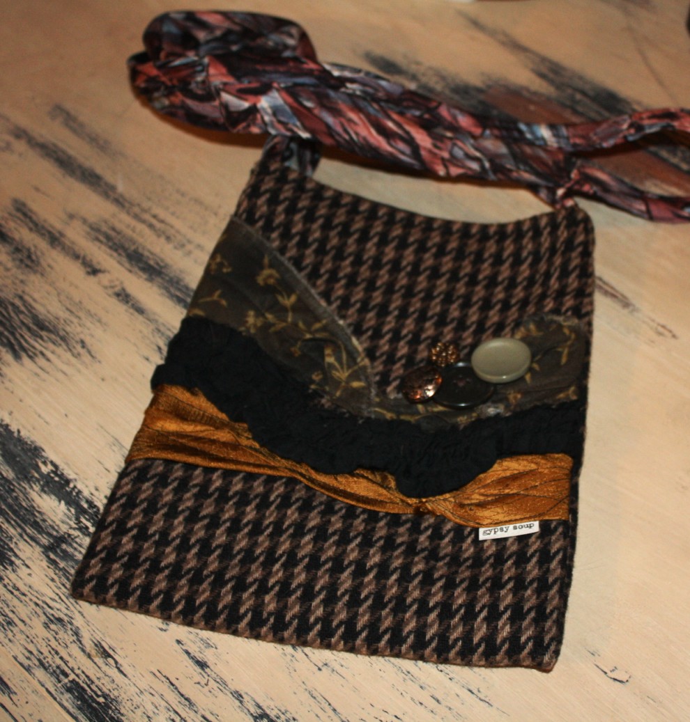 This across body pouch is made of repurposed jackets and/or skirts, with kneck tie guts that make us HAPPY! This pouch was constructed with various vintagey linens, fabrics and tie guts!!! 90% repurposed materials! All Handmade my GypsySoup in Kansas City, Missouri!