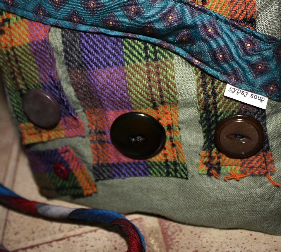 This across body pouch is made of repurposed jackets and/or skirts, with kneck tie guts that make us HAPPY! This pouch was constructed with various vintagey linens, fabrics and tie guts!!! 90% repurposed materials! All Handmade my GypsySoup in Kansas City, Missouri!